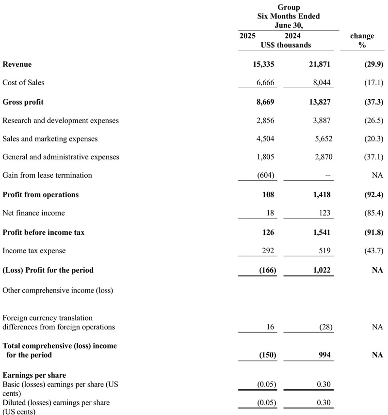 The Group reported a net loss of US$ 0.2 million in H1 2025 compared to a net profit of US$1.0 million in H1 2024 as cost saving steps, development capitalisation, and the windfall offset the lower gross profit, all as detailed above.